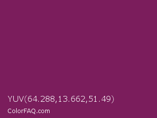 YUV 64.288,13.662,51.49 Color is a dark magenta color and the nearest color is French Plum #811453. Hex code #7b1d5c and RGB value is rgb(123,29,92). In RGB color space, this color is composed of 48% red, 11% green, 36% blue, In CMYK color space, this color is composed of 0% cyan, 76% magenta, 25% yellow , 52% black , In HSL color space, this color has a hue angle of 320° , 62% saturation and 30% lightness.