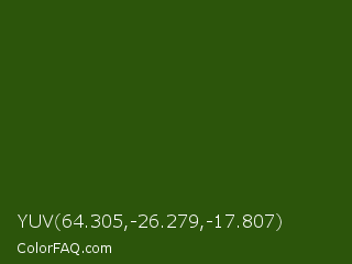 YUV 64.305,-26.279,-17.807 Color is a very dark green color and the nearest color is Green House #24500f. Hex code #2c550b and RGB value is rgb(44,85,11). In RGB color space, this color is composed of 17% red, 33% green, 4% blue, In CMYK color space, this color is composed of 48% cyan, 0% magenta, 87% yellow , 67% black , In HSL color space, this color has a hue angle of 93° , 77% saturation and 19% lightness.