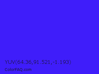 YUV 64.36,91.521,-1.193 Color is a normal indigo color and the nearest color is Han Purple #5218fa. Hex code #3f1dfa and RGB value is rgb(63,29,250). In RGB color space, this color is composed of 25% red, 11% green, 98% blue, In CMYK color space, this color is composed of 75% cyan, 88% magenta, 0% yellow , 2% black , In HSL color space, this color has a hue angle of 249° , 96% saturation and 55% lightness.