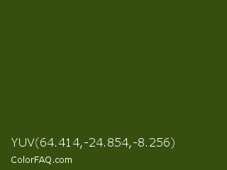 YUV 64.414,-24.854,-8.256 Color is a very dark green color and the nearest color is Clover #384910. Hex code #374f0e and RGB value is rgb(55,79,14). In RGB color space, this color is composed of 22% red, 31% green, 5% blue, In CMYK color space, this color is composed of 30% cyan, 0% magenta, 82% yellow , 69% black , In HSL color space, this color has a hue angle of 82° , 70% saturation and 18% lightness.