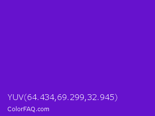 YUV 64.434,69.299,32.945 Color is a normal violet color and the nearest color is Purple Heart Crayola #652dc1. Hex code #6612cd and RGB value is rgb(102,18,205). In RGB color space, this color is composed of 40% red, 7% green, 80% blue, In CMYK color space, this color is composed of 50% cyan, 91% magenta, 0% yellow , 20% black , In HSL color space, this color has a hue angle of 267° , 84% saturation and 44% lightness.