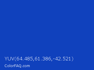 YUV 64.485,61.386,-42.521 Color is a normal blue color and the nearest color is Persian Blue #1c39bb. Hex code #1041bd and RGB value is rgb(16,65,189). In RGB color space, this color is composed of 6% red, 25% green, 74% blue, In CMYK color space, this color is composed of 92% cyan, 66% magenta, 0% yellow , 26% black , In HSL color space, this color has a hue angle of 223° , 84% saturation and 40% lightness.