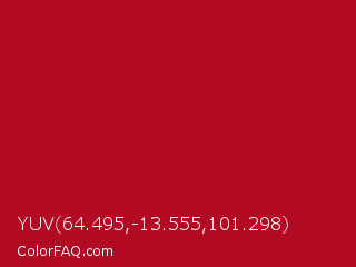 YUV 64.495,-13.555,101.298 Color is a normal red color and the nearest color is Shiraz #b20931. Hex code #b40b25 and RGB value is rgb(180,11,37). In RGB color space, this color is composed of 71% red, 4% green, 15% blue, In CMYK color space, this color is composed of 0% cyan, 94% magenta, 79% yellow , 29% black , In HSL color space, this color has a hue angle of 351° , 88% saturation and 37% lightness.
