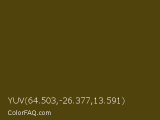 YUV 64.503,-26.377,13.591 Color is a very dark yellow color and the nearest color is Bronze Olive #4e420c. Hex code #50430b and RGB value is rgb(80,67,11). In RGB color space, this color is composed of 31% red, 26% green, 4% blue, In CMYK color space, this color is composed of 0% cyan, 16% magenta, 86% yellow , 69% black , In HSL color space, this color has a hue angle of 49° , 76% saturation and 18% lightness.