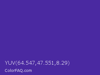 YUV 64.547,47.551,8.29 Color is a normal indigo color and the nearest color is Daisy Bush #4f2398. Hex code #4a29a1 and RGB value is rgb(74,41,161). In RGB color space, this color is composed of 29% red, 16% green, 63% blue, In CMYK color space, this color is composed of 54% cyan, 75% magenta, 0% yellow , 37% black , In HSL color space, this color has a hue angle of 257° , 59% saturation and 40% lightness.