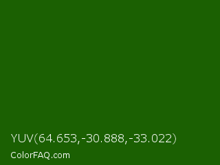 YUV 64.653,-30.888,-33.022 Color is a very dark green color and the nearest color is Lincoln Green #195905. Hex code #1b6002 and RGB value is rgb(27,96,2). In RGB color space, this color is composed of 11% red, 38% green, 1% blue, In CMYK color space, this color is composed of 72% cyan, 0% magenta, 98% yellow , 62% black , In HSL color space, this color has a hue angle of 104° , 96% saturation and 19% lightness.