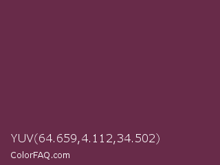 YUV 64.659,4.112,34.502 Color is a dark rose color and the nearest color is Wine Dregs #673147. Hex code #682b49 and RGB value is rgb(104,43,73). In RGB color space, this color is composed of 41% red, 17% green, 29% blue, In CMYK color space, this color is composed of 0% cyan, 59% magenta, 30% yellow , 59% black , In HSL color space, this color has a hue angle of 330° , 41% saturation and 29% lightness.