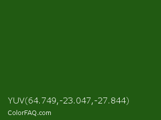 YUV 64.749,-23.047,-27.844 Color is a very dark green color and the nearest color is Green House #24500f. Hex code #215a12 and RGB value is rgb(33,90,18). In RGB color space, this color is composed of 13% red, 35% green, 7% blue, In CMYK color space, this color is composed of 63% cyan, 0% magenta, 80% yellow , 65% black , In HSL color space, this color has a hue angle of 108° , 67% saturation and 21% lightness.