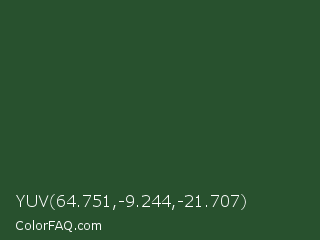YUV 64.751,-9.244,-21.707 Color is a dark green color and the nearest color is Cal Poly Pomona Green #1e4d2b. Hex code #28512e and RGB value is rgb(40,81,46). In RGB color space, this color is composed of 16% red, 32% green, 18% blue, In CMYK color space, this color is composed of 51% cyan, 0% magenta, 43% yellow , 68% black , In HSL color space, this color has a hue angle of 129° , 34% saturation and 24% lightness.