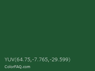 YUV 64.75,-7.765,-29.599 Color is a dark green color and the nearest color is Cal Poly Pomona Green #1e4d2b. Hex code #1f5531 and RGB value is rgb(31,85,49). In RGB color space, this color is composed of 12% red, 33% green, 19% blue, In CMYK color space, this color is composed of 64% cyan, 0% magenta, 42% yellow , 67% black , In HSL color space, this color has a hue angle of 140° , 47% saturation and 23% lightness.