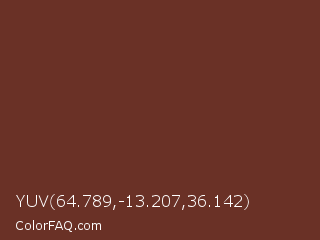 YUV 64.789,-13.207,36.142 Color is a dark red color and the nearest color is Liver Organ #6c2e1f. Hex code #6a3126 and RGB value is rgb(106,49,38). In RGB color space, this color is composed of 42% red, 19% green, 15% blue, In CMYK color space, this color is composed of 0% cyan, 54% magenta, 64% yellow , 58% black , In HSL color space, this color has a hue angle of 10° , 47% saturation and 28% lightness.