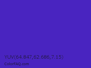 YUV 64.847,62.686,7.15 Color is a normal indigo color and the nearest color is Purple Heart Crayola #652dc1. Hex code #4924c0 and RGB value is rgb(73,36,192). In RGB color space, this color is composed of 29% red, 14% green, 75% blue, In CMYK color space, this color is composed of 62% cyan, 81% magenta, 0% yellow , 25% black , In HSL color space, this color has a hue angle of 254° , 68% saturation and 45% lightness.
