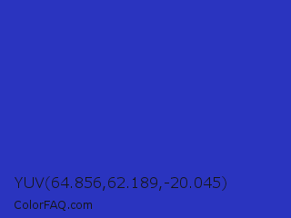 YUV 64.856,62.189,-20.045 Color is a normal blue color and the nearest color is Governor Bay #2f3cb3. Hex code #2a34bf and RGB value is rgb(42,52,191). In RGB color space, this color is composed of 16% red, 20% green, 75% blue, In CMYK color space, this color is composed of 78% cyan, 73% magenta, 0% yellow , 25% black , In HSL color space, this color has a hue angle of 236° , 64% saturation and 46% lightness.
