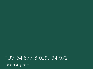 YUV 64.877,3.019,-34.972 Color is a very dark cyan color and the nearest color is Brunswick Green #1b4d3e. Hex code #195447 and RGB value is rgb(25,84,71). In RGB color space, this color is composed of 10% red, 33% green, 28% blue, In CMYK color space, this color is composed of 70% cyan, 0% magenta, 15% yellow , 67% black , In HSL color space, this color has a hue angle of 167° , 54% saturation and 21% lightness.