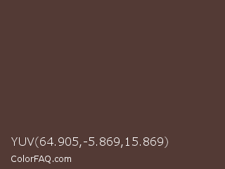 YUV 64.905,-5.869,15.869 Color is a dark red color and the nearest color is Dark Liver Horses #543d37. Hex code #533a35 and RGB value is rgb(83,58,53). In RGB color space, this color is composed of 33% red, 23% green, 21% blue, In CMYK color space, this color is composed of 0% cyan, 30% magenta, 36% yellow , 67% black , In HSL color space, this color has a hue angle of 10° , 22% saturation and 27% lightness.