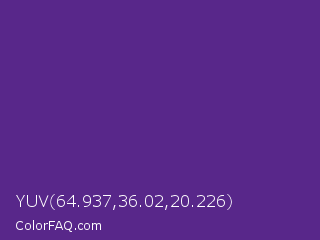 YUV 64.937,36.02,20.226 Color is a normal violet color and the nearest color is KSU Purple #512888. Hex code #58278a and RGB value is rgb(88,39,138). In RGB color space, this color is composed of 35% red, 15% green, 54% blue, In CMYK color space, this color is composed of 36% cyan, 72% magenta, 0% yellow , 46% black , In HSL color space, this color has a hue angle of 270° , 56% saturation and 35% lightness.
