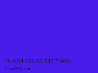 YUV 64.939,83.347,7.069 Color is a normal indigo color and the nearest color is Han Purple #5218fa. Hex code #491cea and RGB value is rgb(73,28,234). In RGB color space, this color is composed of 29% red, 11% green, 92% blue, In CMYK color space, this color is composed of 69% cyan, 88% magenta, 0% yellow , 8% black , In HSL color space, this color has a hue angle of 253° , 83% saturation and 51% lightness.