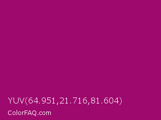 YUV 64.951,21.716,81.604 Color is a normal magenta color and the nearest color is Flirt #a2006d. Hex code #9e096d and RGB value is rgb(158,9,109). In RGB color space, this color is composed of 62% red, 4% green, 43% blue, In CMYK color space, this color is composed of 0% cyan, 94% magenta, 31% yellow , 38% black , In HSL color space, this color has a hue angle of 320° , 89% saturation and 33% lightness.