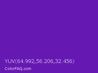 YUV 64.992,56.206,32.456 Color is a normal violet color and the nearest color is Purple Heart Crayola #652dc1. Hex code #6618b3 and RGB value is rgb(102,24,179). In RGB color space, this color is composed of 40% red, 9% green, 70% blue, In CMYK color space, this color is composed of 43% cyan, 87% magenta, 0% yellow , 30% black , In HSL color space, this color has a hue angle of 270° , 76% saturation and 40% lightness.