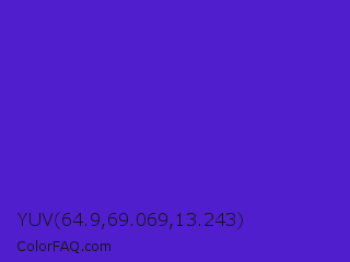 YUV 64.9,69.069,13.243 Color is a normal indigo color and the nearest color is Purple Heart Crayola #652dc1. Hex code #501ecd and RGB value is rgb(80,30,205). In RGB color space, this color is composed of 31% red, 12% green, 80% blue, In CMYK color space, this color is composed of 61% cyan, 85% magenta, 0% yellow , 20% black , In HSL color space, this color has a hue angle of 257° , 74% saturation and 46% lightness.