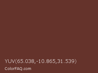 YUV 65.038,-10.865,31.539 Color is a dark red color and the nearest color is Buccaneer #622f30. Hex code #65332b and RGB value is rgb(101,51,43). In RGB color space, this color is composed of 40% red, 20% green, 17% blue, In CMYK color space, this color is composed of 0% cyan, 50% magenta, 57% yellow , 60% black , In HSL color space, this color has a hue angle of 8° , 40% saturation and 28% lightness.