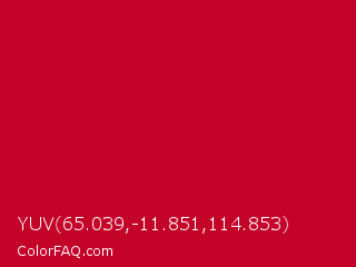 YUV 65.039,-11.851,114.853 Color is a normal red color and the nearest color is Red NCS #c40233. Hex code #c40329 and RGB value is rgb(196,3,41). In RGB color space, this color is composed of 77% red, 1% green, 16% blue, In CMYK color space, this color is composed of 0% cyan, 98% magenta, 79% yellow , 23% black , In HSL color space, this color has a hue angle of 348° , 97% saturation and 39% lightness.
