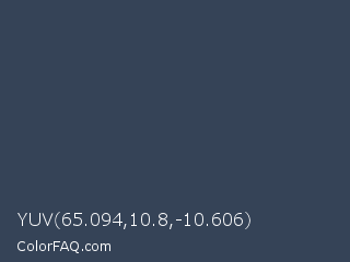 YUV 65.094,10.8,-10.606 Color is a dark blue color and the nearest color is Oxford Blue #384555. Hex code #354357 and RGB value is rgb(53,67,87). In RGB color space, this color is composed of 21% red, 26% green, 34% blue, In CMYK color space, this color is composed of 39% cyan, 23% magenta, 0% yellow , 66% black , In HSL color space, this color has a hue angle of 215° , 24% saturation and 27% lightness.