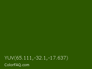 YUV 65.111,-32.1,-17.637 Color is a very dark green color and the nearest color is Green House #24500f. Hex code #2d5800 and RGB value is rgb(45,88,-0). In RGB color space, this color is composed of 18% red, 35% green, 0% blue, In CMYK color space, this color is composed of 49% cyan, 0% magenta, 100% yellow , 65% black , In HSL color space, this color has a hue angle of 89° , 100% saturation and 17% lightness.