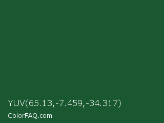 YUV 65.13,-7.459,-34.317 Color is a very dark green color and the nearest color is Cal Poly Pomona Green #1e4d2b. Hex code #1a5832 and RGB value is rgb(26,88,50). In RGB color space, this color is composed of 10% red, 35% green, 20% blue, In CMYK color space, this color is composed of 70% cyan, 0% magenta, 43% yellow , 65% black , In HSL color space, this color has a hue angle of 143° , 54% saturation and 22% lightness.