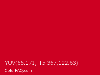YUV 65.171,-15.367,122.63 Color is a normal red color and the nearest color is Monza #c7031e. Hex code #cd0022 and RGB value is rgb(205,-0,34). In RGB color space, this color is composed of 80% red, 0% green, 13% blue, In CMYK color space, this color is composed of 0% cyan, 100% magenta, 83% yellow , 20% black , In HSL color space, this color has a hue angle of 350° , 100% saturation and 40% lightness.