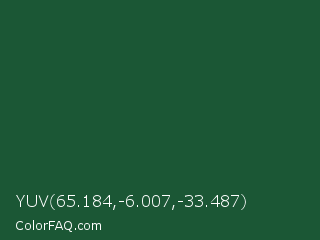 YUV 65.184,-6.007,-33.487 Color is a very dark green color and the nearest color is Brunswick Green #1b4d3e. Hex code #1b5735 and RGB value is rgb(27,87,53). In RGB color space, this color is composed of 11% red, 34% green, 21% blue, In CMYK color space, this color is composed of 69% cyan, 0% magenta, 39% yellow , 66% black , In HSL color space, this color has a hue angle of 146° , 53% saturation and 22% lightness.