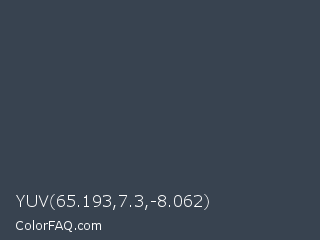 YUV 65.193,7.3,-8.062 Color is a dark blue color and the nearest color is Charcoal #36454f. Hex code #384350 and RGB value is rgb(56,67,80). In RGB color space, this color is composed of 22% red, 26% green, 31% blue, In CMYK color space, this color is composed of 30% cyan, 16% magenta, 0% yellow , 69% black , In HSL color space, this color has a hue angle of 213° , 18% saturation and 27% lightness.