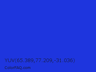 YUV 65.389,77.209,-31.036 Color is a normal blue color and the nearest color is Palatinate Blue #273be2. Hex code #1e35de and RGB value is rgb(30,53,222). In RGB color space, this color is composed of 12% red, 21% green, 87% blue, In CMYK color space, this color is composed of 86% cyan, 76% magenta, 0% yellow , 13% black , In HSL color space, this color has a hue angle of 233° , 76% saturation and 49% lightness.