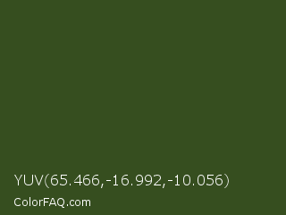 YUV 65.466,-16.992,-10.056 Color is a very dark green color and the nearest color is Clover #384910. Hex code #364e1f and RGB value is rgb(54,78,31). In RGB color space, this color is composed of 21% red, 31% green, 12% blue, In CMYK color space, this color is composed of 31% cyan, 0% magenta, 60% yellow , 69% black , In HSL color space, this color has a hue angle of 91° , 43% saturation and 21% lightness.