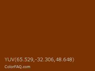 YUV 65.529,-32.306,48.648 Color is a dark orange color and the nearest color is Red Beech #7b3801. Hex code #793200 and RGB value is rgb(121,50,-0). In RGB color space, this color is composed of 47% red, 20% green, 0% blue, In CMYK color space, this color is composed of 0% cyan, 59% magenta, 100% yellow , 53% black , In HSL color space, this color has a hue angle of 25° , 100% saturation and 24% lightness.