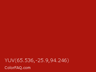 YUV 65.536,-25.9,94.246 Color is a normal red color and the nearest color is Rufous #a81c07. Hex code #ad150d and RGB value is rgb(173,21,13). In RGB color space, this color is composed of 68% red, 8% green, 5% blue, In CMYK color space, this color is composed of 0% cyan, 88% magenta, 92% yellow , 32% black , In HSL color space, this color has a hue angle of 3° , 86% saturation and 36% lightness.