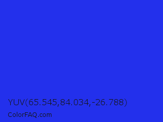 YUV 65.545,84.034,-26.788 Color is a normal blue color and the nearest color is Palatinate Blue #273be2. Hex code #2330ec and RGB value is rgb(35,48,236). In RGB color space, this color is composed of 14% red, 19% green, 93% blue, In CMYK color space, this color is composed of 85% cyan, 80% magenta, 0% yellow , 7% black , In HSL color space, this color has a hue angle of 236° , 84% saturation and 53% lightness.