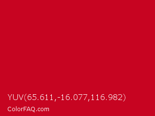 YUV 65.611,-16.077,116.982 Color is a normal red color and the nearest color is Monza #c7031e. Hex code #c70421 and RGB value is rgb(199,4,33). In RGB color space, this color is composed of 78% red, 2% green, 13% blue, In CMYK color space, this color is composed of 0% cyan, 98% magenta, 83% yellow , 22% black , In HSL color space, this color has a hue angle of 351° , 96% saturation and 40% lightness.