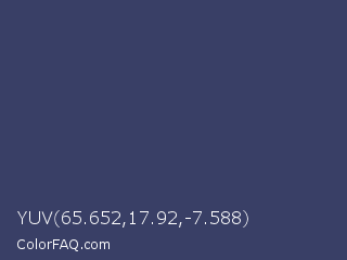 YUV 65.652,17.92,-7.588 Color is a normal blue color and the nearest color is Rhino #2e3f62. Hex code #393f66 and RGB value is rgb(57,63,102). In RGB color space, this color is composed of 22% red, 25% green, 40% blue, In CMYK color space, this color is composed of 44% cyan, 38% magenta, 0% yellow , 60% black , In HSL color space, this color has a hue angle of 232° , 28% saturation and 31% lightness.