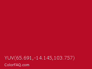 YUV 65.691,-14.145,103.757 Color is a normal red color and the nearest color is Shiraz #b20931. Hex code #b80b25 and RGB value is rgb(184,11,37). In RGB color space, this color is composed of 72% red, 4% green, 15% blue, In CMYK color space, this color is composed of 0% cyan, 94% magenta, 80% yellow , 28% black , In HSL color space, this color has a hue angle of 351° , 89% saturation and 38% lightness.