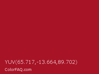 YUV 65.717,-13.664,89.702 Color is a normal red color and the nearest color is Upsdell Red #ae2029. Hex code #a81326 and RGB value is rgb(168,19,38). In RGB color space, this color is composed of 66% red, 7% green, 15% blue, In CMYK color space, this color is composed of 0% cyan, 89% magenta, 77% yellow , 34% black , In HSL color space, this color has a hue angle of 352° , 80% saturation and 37% lightness.
