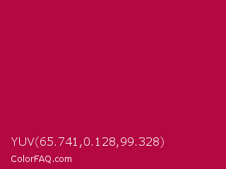YUV 65.741,0.128,99.328 Color is a normal rose color and the nearest color is Shiraz #b20931. Hex code #b30842 and RGB value is rgb(179,8,66). In RGB color space, this color is composed of 70% red, 3% green, 26% blue, In CMYK color space, this color is composed of 0% cyan, 96% magenta, 63% yellow , 30% black , In HSL color space, this color has a hue angle of 340° , 91% saturation and 37% lightness.
