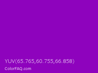 YUV 65.765,60.755,66.858 Color is a normal purple color and the nearest color is Violet RYB #8601af. Hex code #8e03bd and RGB value is rgb(142,3,189). In RGB color space, this color is composed of 56% red, 1% green, 74% blue, In CMYK color space, this color is composed of 25% cyan, 98% magenta, 0% yellow , 26% black , In HSL color space, this color has a hue angle of 285° , 97% saturation and 38% lightness.