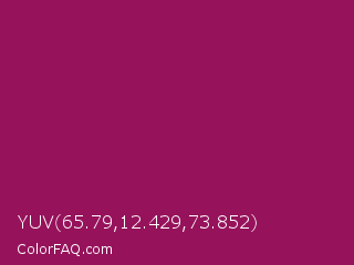 YUV 65.79,12.429,73.852 Color is a normal magenta color and the nearest color is Cardinal Pink #8c055e. Hex code #96125b and RGB value is rgb(150,18,91). In RGB color space, this color is composed of 59% red, 7% green, 36% blue, In CMYK color space, this color is composed of 0% cyan, 88% magenta, 39% yellow , 41% black , In HSL color space, this color has a hue angle of 327° , 79% saturation and 33% lightness.