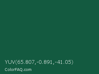 YUV 65.807,-0.891,-41.05 Color is a very dark green color and the nearest color is Green Pea #1d6142. Hex code #135a40 and RGB value is rgb(19,90,64). In RGB color space, this color is composed of 7% red, 35% green, 25% blue, In CMYK color space, this color is composed of 79% cyan, 0% magenta, 29% yellow , 65% black , In HSL color space, this color has a hue angle of 158° , 65% saturation and 21% lightness.