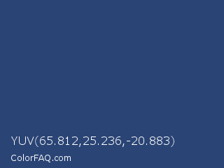 YUV 65.812,25.236,-20.883 Color is a normal blue color and the nearest color is Astronaut #283a77. Hex code #2a4475 and RGB value is rgb(42,68,117). In RGB color space, this color is composed of 16% red, 27% green, 46% blue, In CMYK color space, this color is composed of 64% cyan, 42% magenta, 0% yellow , 54% black , In HSL color space, this color has a hue angle of 219° , 47% saturation and 31% lightness.