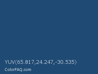 YUV 65.817,24.247,-30.535 Color is a dark blue color and the nearest color is Chathams Blue #175579. Hex code #1f4a73 and RGB value is rgb(31,74,115). In RGB color space, this color is composed of 12% red, 29% green, 45% blue, In CMYK color space, this color is composed of 73% cyan, 36% magenta, 0% yellow , 55% black , In HSL color space, this color has a hue angle of 209° , 58% saturation and 29% lightness.