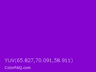 YUV 65.827,70.091,58.911 Color is a normal purple color and the nearest color is French Violet #8806ce. Hex code #8504d0 and RGB value is rgb(133,4,208). In RGB color space, this color is composed of 52% red, 2% green, 82% blue, In CMYK color space, this color is composed of 36% cyan, 98% magenta, 0% yellow , 18% black , In HSL color space, this color has a hue angle of 278° , 96% saturation and 42% lightness.