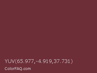 YUV 65.977,-4.919,37.731 Color is a dark red color and the nearest color is Wine #722f37. Hex code #6d2e38 and RGB value is rgb(109,46,56). In RGB color space, this color is composed of 43% red, 18% green, 22% blue, In CMYK color space, this color is composed of 0% cyan, 58% magenta, 49% yellow , 57% black , In HSL color space, this color has a hue angle of 350° , 41% saturation and 30% lightness.