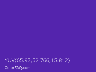 YUV 65.97,52.766,15.812 Color is a normal violet color and the nearest color is Daisy Bush #4f2398. Hex code #5424ad and RGB value is rgb(84,36,173). In RGB color space, this color is composed of 33% red, 14% green, 68% blue, In CMYK color space, this color is composed of 51% cyan, 79% magenta, 0% yellow , 32% black , In HSL color space, this color has a hue angle of 261° , 66% saturation and 41% lightness.
